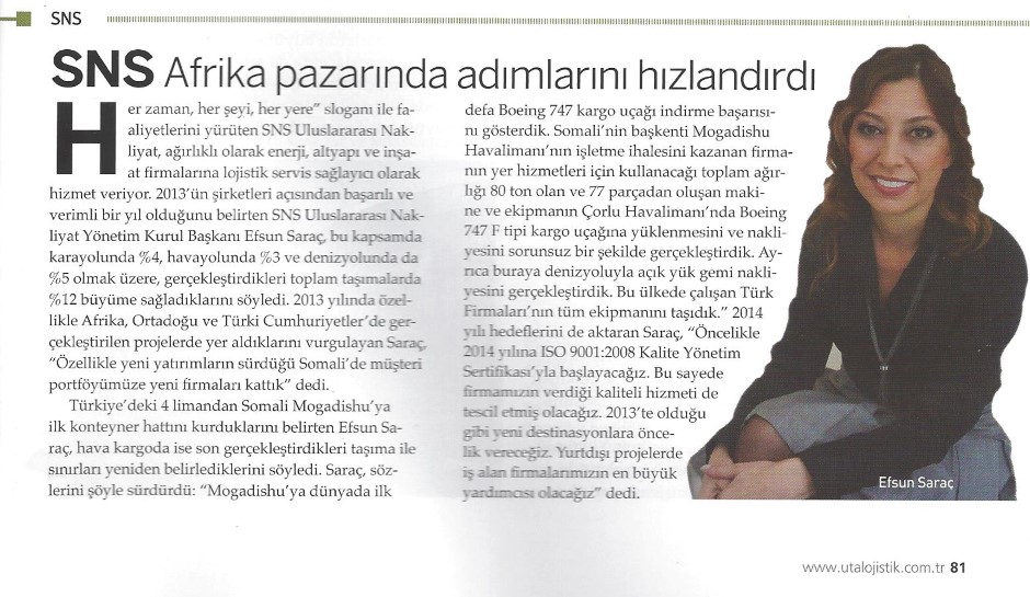 SNS CEO Ms.Efsun SARAC took place in UTA LOJİSTİK magazine